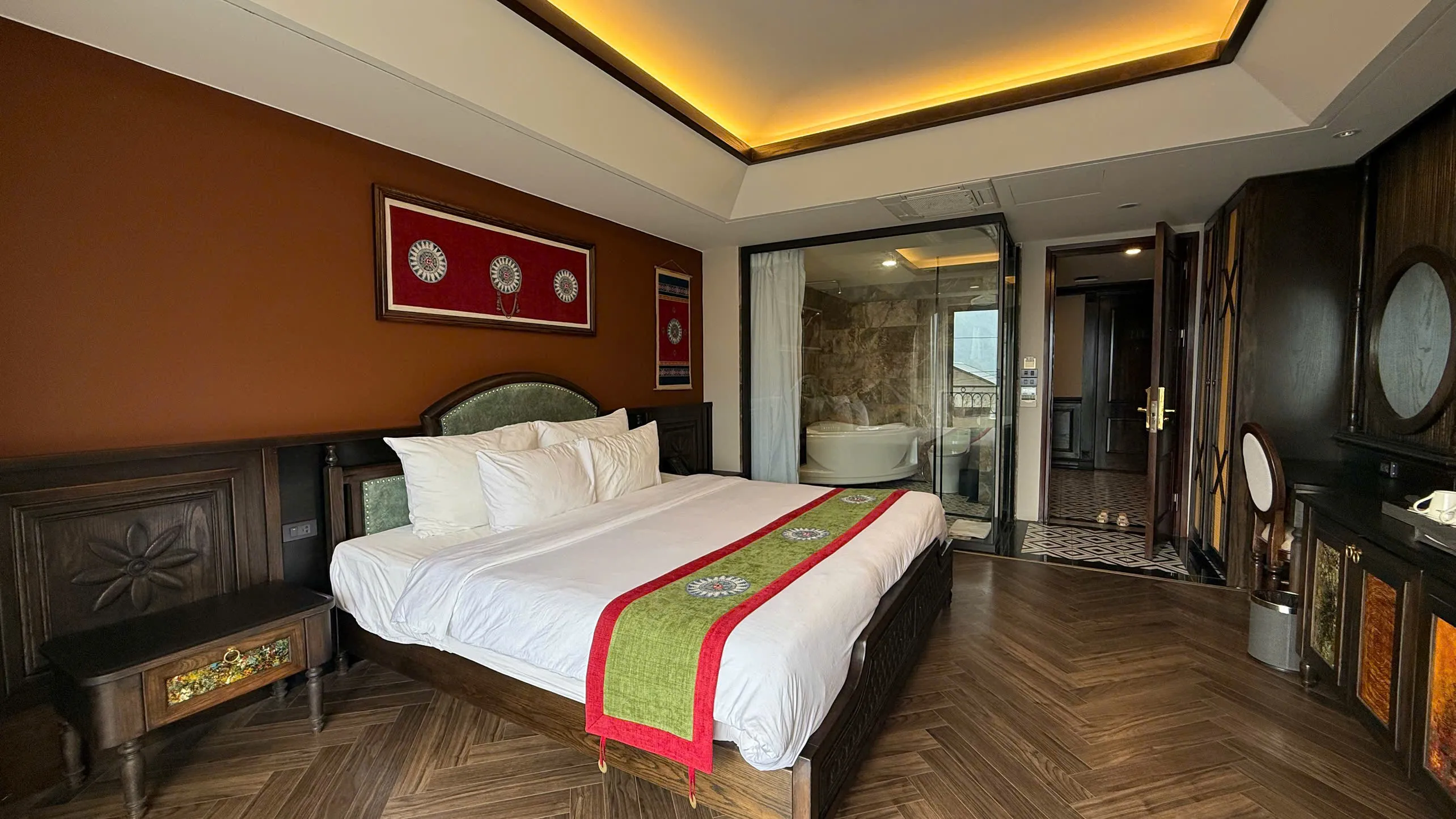 Không gian phòng được chăm chút trong từng chi tiết: sàn gỗ cao cấp, hệ thống đèn trần hiện đại mang ánh sáng mềm dịu, cùng điểm nhấn là họa tiết thổ cẩm đầy màu sắc nổi bật trên giường. Cửa sổ lớn đón ánh sáng tự nhiên, kết hợp rèm 2 lớp giúp điều chỉnh độ sáng linh hoạt, mang lại bầu không khí thoáng đãng nhưng vẫn đảm bảo riêng tư.