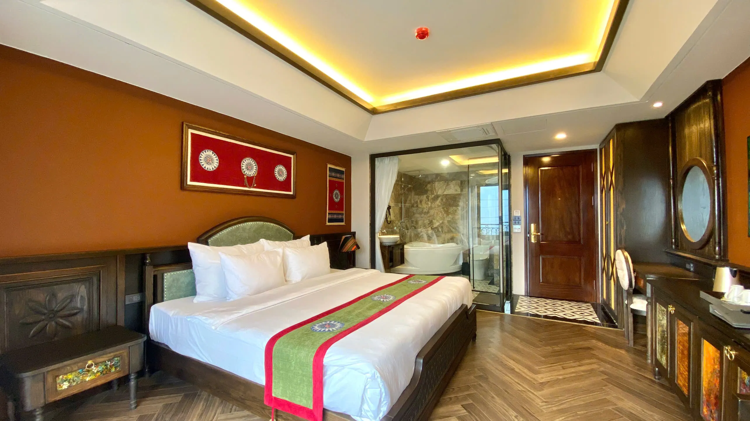 Không gian phòng được chăm chút trong từng chi tiết: sàn gỗ cao cấp, hệ thống đèn trần hiện đại mang ánh sáng mềm dịu, cùng điểm nhấn là họa tiết thổ cẩm đầy màu sắc nổi bật trên giường. Cửa sổ lớn đón ánh sáng tự nhiên, kết hợp rèm 2 lớp giúp điều chỉnh độ sáng linh hoạt, mang lại bầu không khí thoáng đãng nhưng vẫn đảm bảo riêng tư.